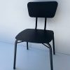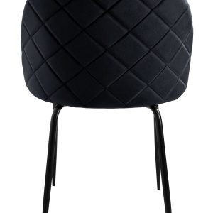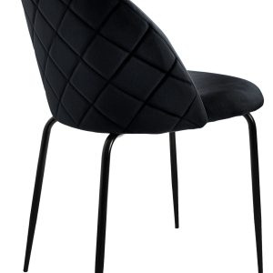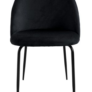 Su estructura está compuesta por cuatro patas delgadas de metal negro, que le aportan estabilidad y un toque sofisticado. El asiento y el respaldo están tapizados en un tejido aterciopelado proporcionando comodidad y un aspecto lujoso.