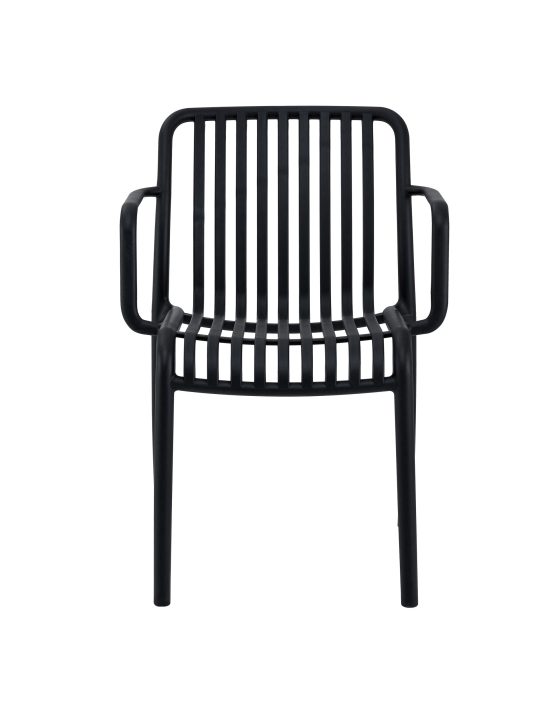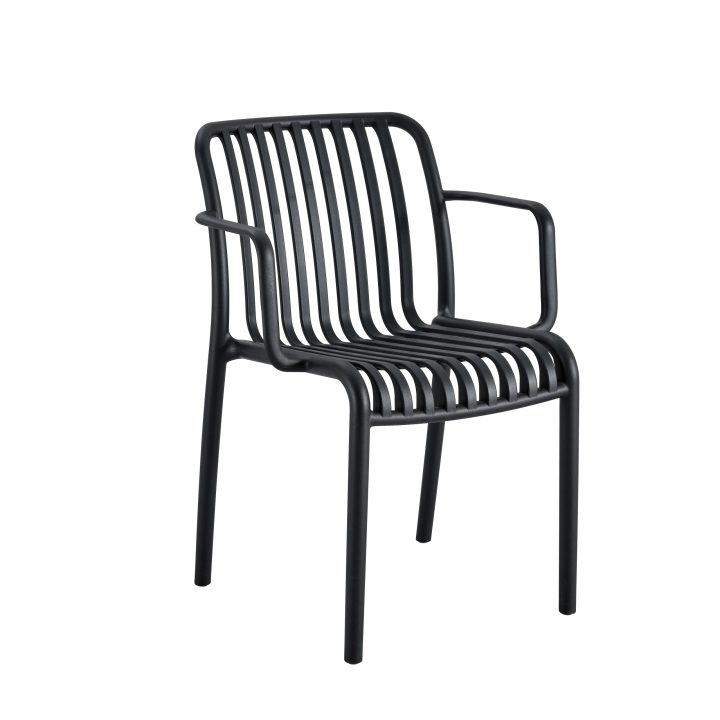 Disponible en blanco o negro, su diseño abierto con listones curvos aporta frescura visual y permite una buena ventilación. Es apilable, lo que facilita su almacenamiento, y gracias a su respaldo ergonómico con ligera curvatura, brinda una experiencia cómoda incluso en usos prolongados.