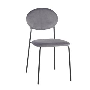 Su estructura está compuesta por cuatro patas delgadas de metal negro, que le aportan estabilidad y un toque sofisticado. El asiento y el respaldo están tapizados en un tejido aterciopelado proporcionando comodidad y un aspecto lujoso.